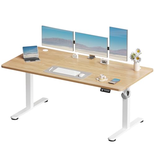 FEZIBO Bureau Électrique Réglable en Hauteur avec Ports de Charge USB-A et USB-C, 100 × 60 cm, Bureau Assis Debout, Ergonomique pour Télétravail, Planche Chêne Blanc