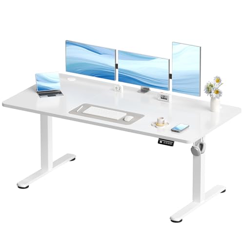 FEZIBO Bureau Debout Électrique Réglable en Hauteur, Table de 152 x 60 cm, Bureau de Travail Assis-Debout avec Panneau d'Assemblage, Cadre Blanc/Plateau Blanc