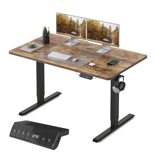 FEZIBO Bureau Assis Debout avec Ports de Charge USB-A et USB-C - 120 x 60 cm - Bureau électrique réglable en Hauteur - Standing Desk - Marron