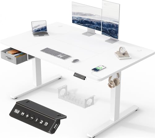 Devoko Bureau Assis Debout électrique réglable en Hauteur 120 x 60 cm avec tiroirs, Port de Charge USB-A d'ordinateur avec Plateau de Gestion des câbles sur Pied avec 3 Fonctions mémoire, Blanc