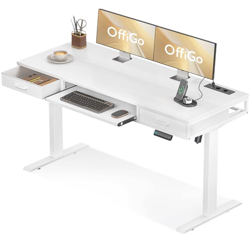 OffiGo Bureau Assis Debout avec tiroirs, 140 cm Bureau Réglable électrique avec Tablette pour Clavier,Standing Desk, Blanc