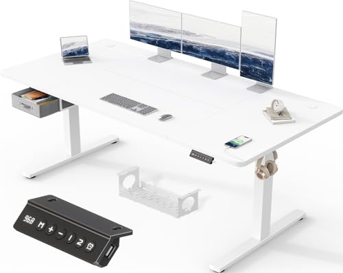 Devoko Bureau Assis Debout électrique réglable en Hauteur 140 x 70 cm avec tiroirs, Port de Charge USB-A d'ordinateur avec Plateau de Gestion des câbles sur Pied avec 3 Fonctions mémoire Blanc