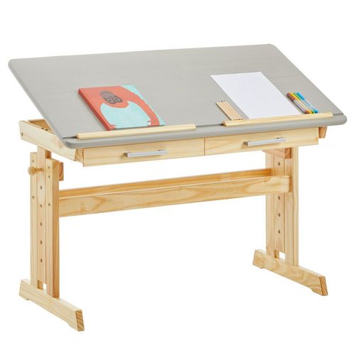Bureau enfant OLIVIA, en bois massif, réglable en hauteur et inclinable, vernis et lasuré gris gris / marron 109 x 130 x 55 cm