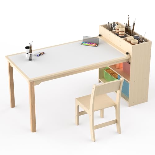 Puecrof Bureau Enfant avec Chaise en Bois de Bouleau – Table Créative avec Rangement pour Dessin, Bricolage et Jeu