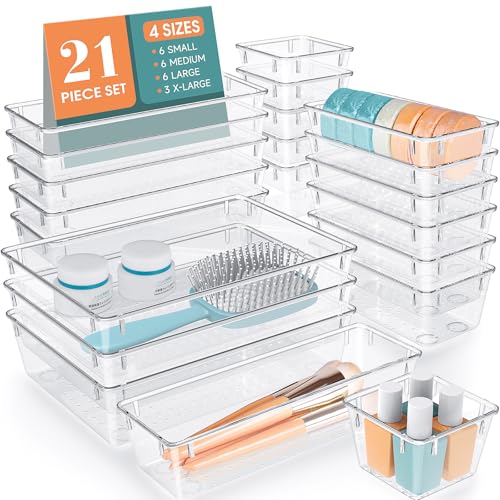 WOWBOX Lot de 21 organiseurs de tiroir en plastique transparent, 4 tailles, organiseurs de tiroir de bureau et bacs de rangement pour maquillage, bijoux, gadgets pour cuisine, chambre, salle de bain,