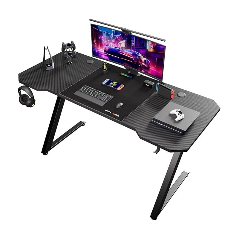 Gtplayer - Bureau Gaming 120 x 60 cm, Bureau Gamer avec Tapis de Souris, Table Gaming pc en Fibre de Carbone avec Crochet pour Casque, Avec Prise