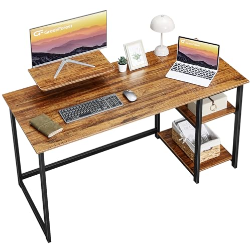 GreenForest Bureau avec Rangement,Petite Bureau d’Ordinateur avec Support de Moniteur, Bureau Gaming avec Étagères de Réversibles, 140cm Bureaux à Domicile et Postes de Travail Informatiques,Marron