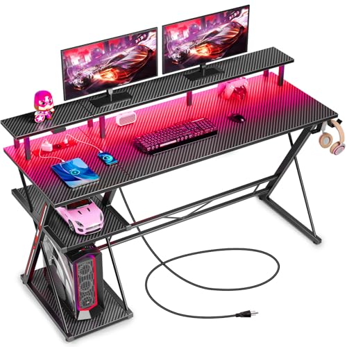 ODK Bureau Gaming avec Lumières LED et Prises électriques, 100 cm Bureau Gamer avec Support de Moniteur et étagère de Rangement Fibre de Carbone Noir