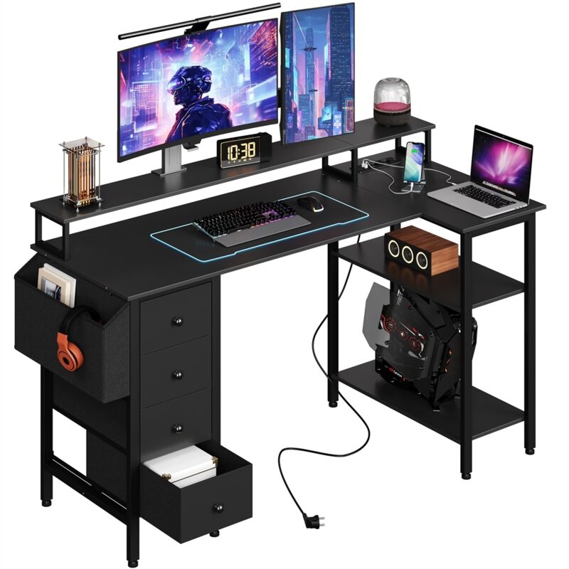 Bureau Gaming en L avec LED & Prise de Courant, Bureau Réversible 53" avec Étagère, Sac de Rangement pour Bureau à Domicile, Noir