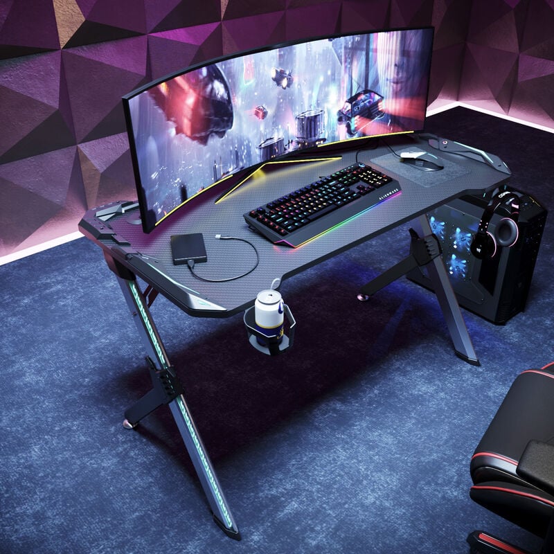 Vasagle - Bureau Gaming avec Lumières led et Multiprise, Bureau Informatique avec Support d'Écran, Table avec Rangement, 2 Tiroirs, 2 Ports usb, pour