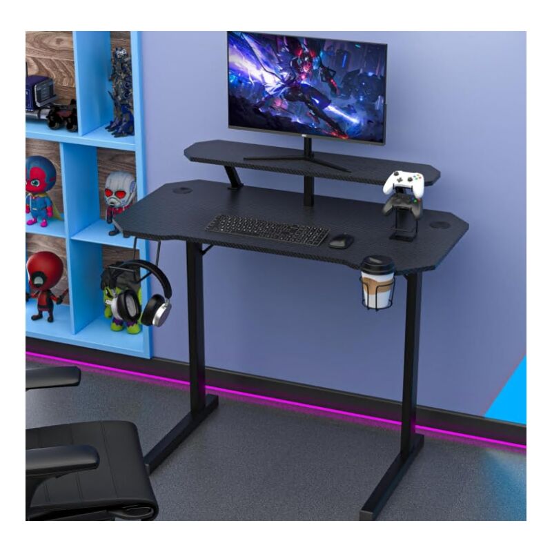 Bureau Gaming Professionnel avec Surface Carbone - 100x55x75cm Design Ergonomique Rangement Intégré (Porte-Casque, Support Console, Porte-Gobelet)
