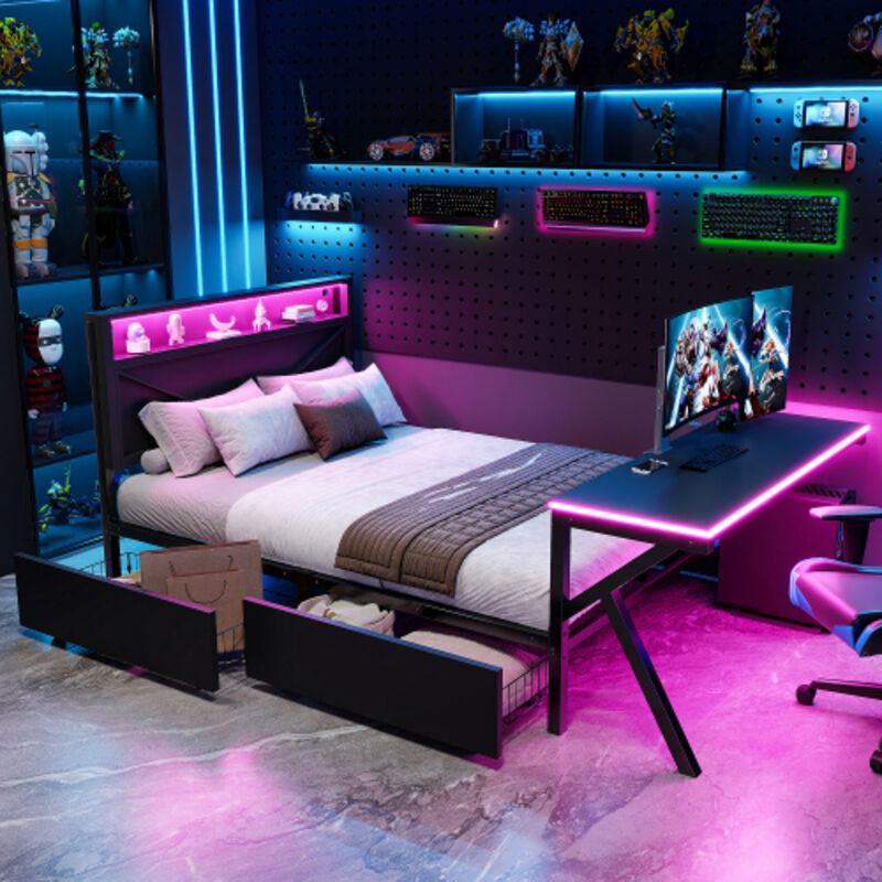 Lit plateforme gaming 140x200cm avec tête de lit LED, Lit coffre avec bureau LED intégré et 2 tiroirs de rangement, structure en métal robuste, noir