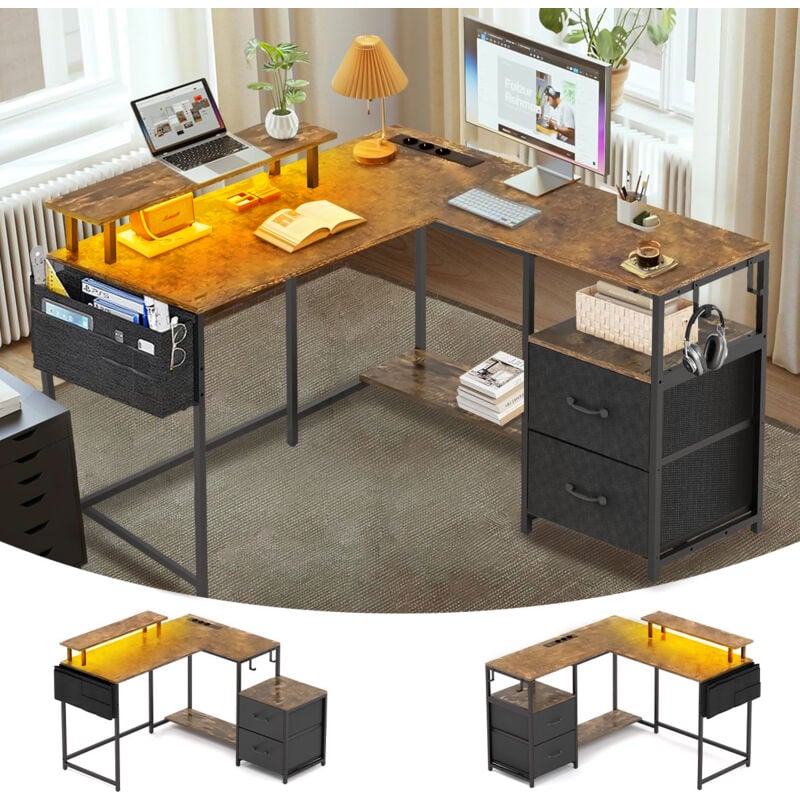 Klyvvo 160x80cm - 3 Tiroirs Bureau d'angle avec Rangement - Grand Bureau Gaming en L avec LED - Support d'écran - Port de Chargement USB et Prise de