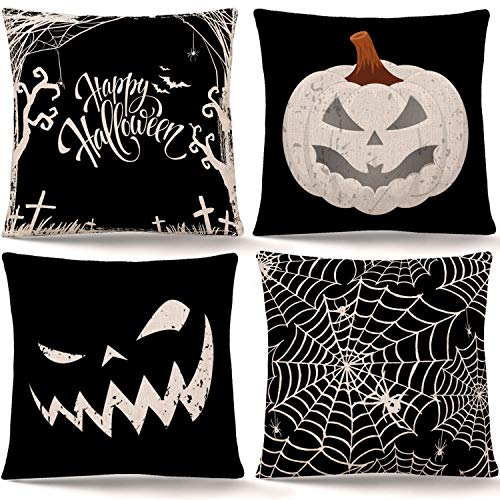 Whaline Lot de 4 Housses de Coussin en Lin Noir avec Motif Toile d'araignée Citrouille pour Maison, Bureau, Halloween, canapé, lit, 45,7 x 45,7 cm