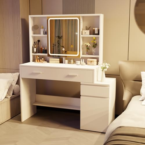 JUMMICO Coiffeuse LED 10 Boules & Miroir Magnifiant - 3C/10Niv Lumière Tactile, Table de Maquillage 4 Tiroirs, 6 Cases, 10 Crochets, Bureau Vanité Moderne pour Chambre, Blanc