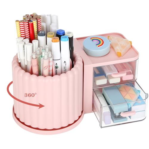 LETURE Organisateurs de bureau rotatifs et accessoires avec 2 tiroirs, porte-crayon, marqueur pour bureau, organiseurs de rangement et accessoires pour fournitures d'art de bureau et maison (rose)