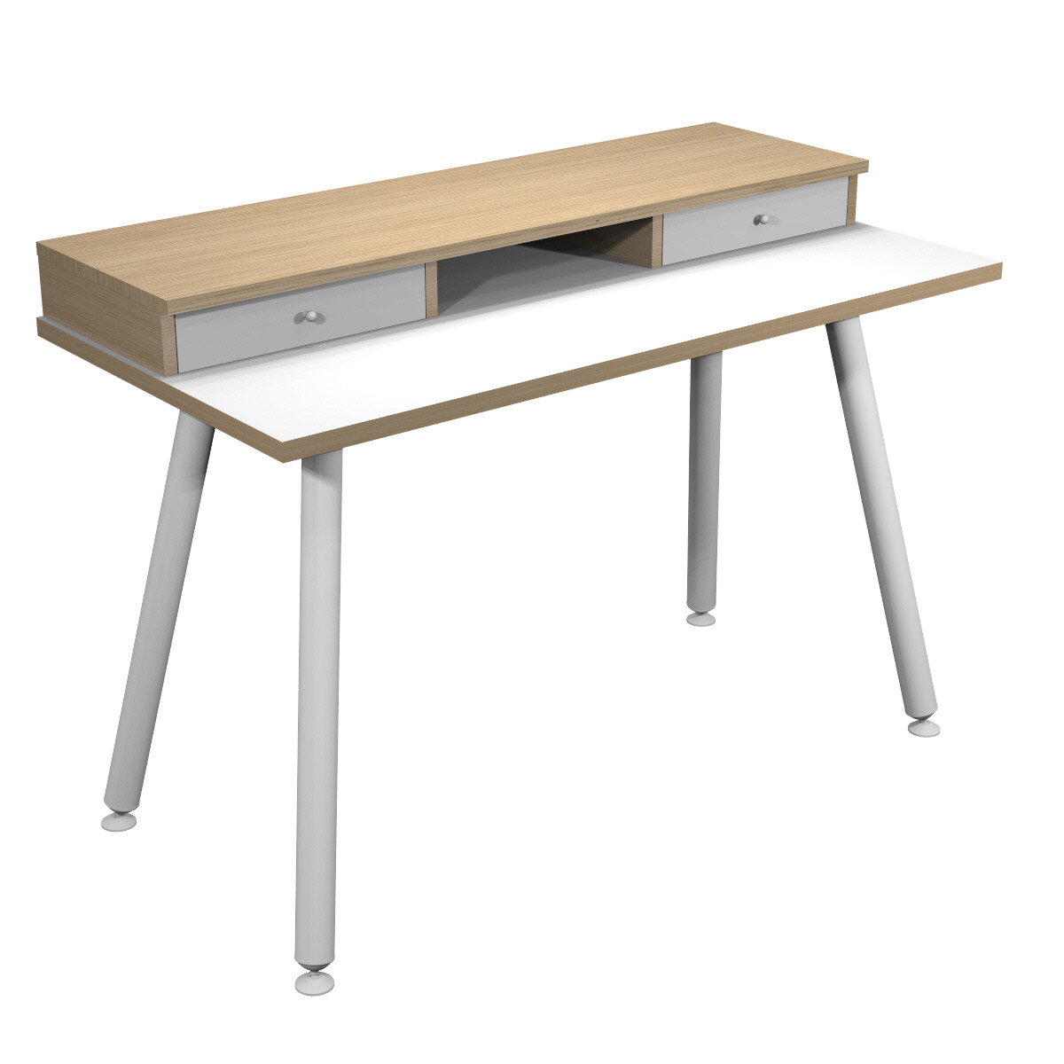 Bureau télétravail Elizey pieds métal 120 x 60 cm réhausse 2 tiroirs et niche de rangement- Chêne naturel / Blanc
