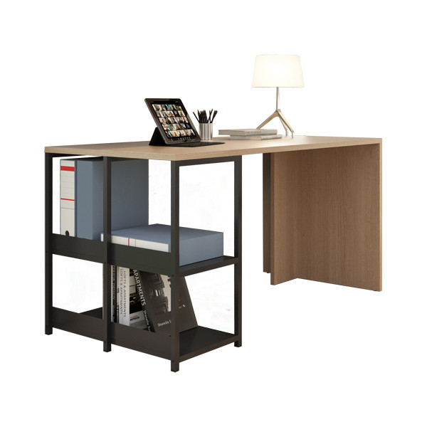 Bureau de télétravail Grafic L.140 x H.72,4 cm avec 2 étagères métalliques intégrées Chêne / Noir