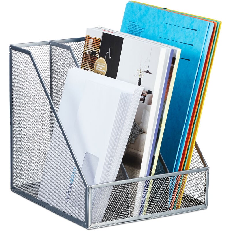 Range-revues, 3 compartiments, format A4, design maille, hlp 26x24x26 cm, bureau/télétravail, métal, argenté - Relaxdays