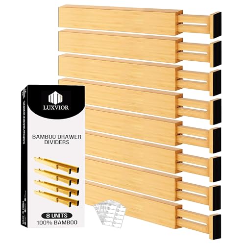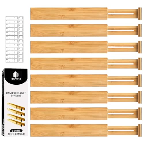 LUXVIOR Lot de 8 séparateurs de tiroir extensibles en bambou, organiseur de tiroir réglable, tiroirs de rangement multifonction pour vêtements, salle de bain, bureau, commode, tiroir de cuisine,