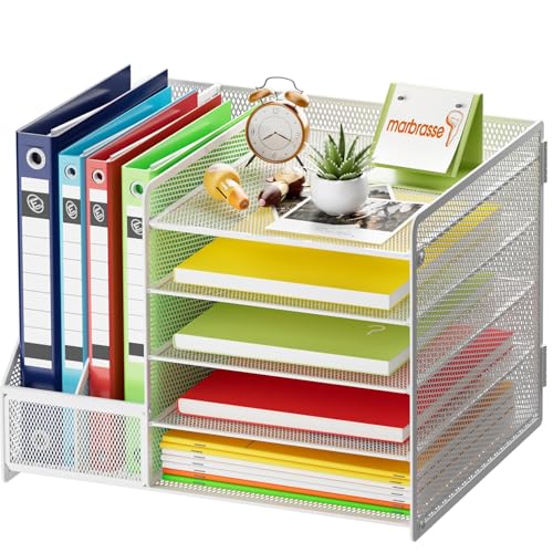 Marbrasse Organisateur de Bureau avec Porte-Documents,5 Niveaux - Porte-Lettres avec Tiroir et 2 Porte-Stylos - Compartiments de Rangement en Maille pour Fournitures de Bureau(Blanc sans Tiroir)