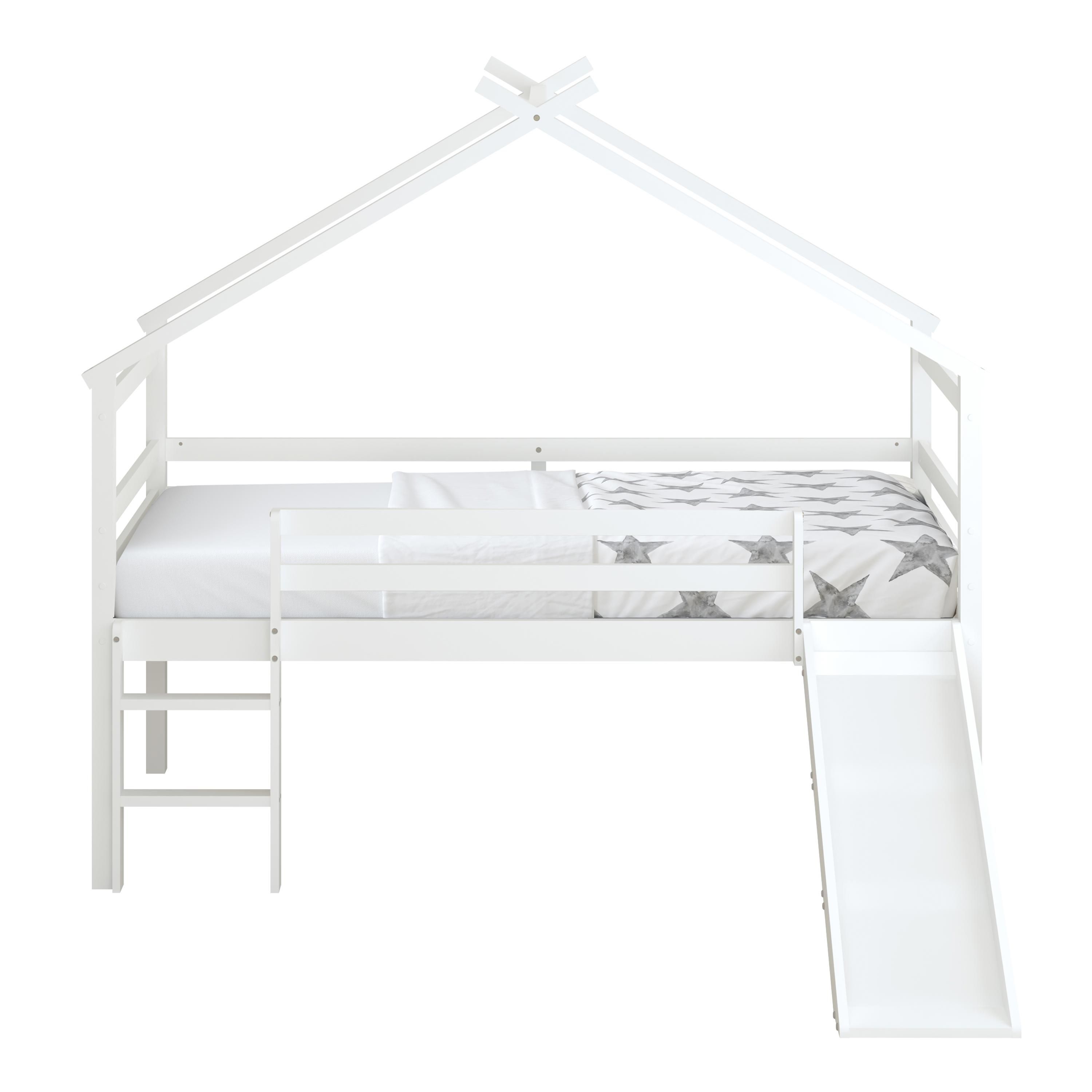 Lit superposé cabane avec toboggan et échelle d’angle 3 marches 90x200 cm, blanc et naturel chicfurn