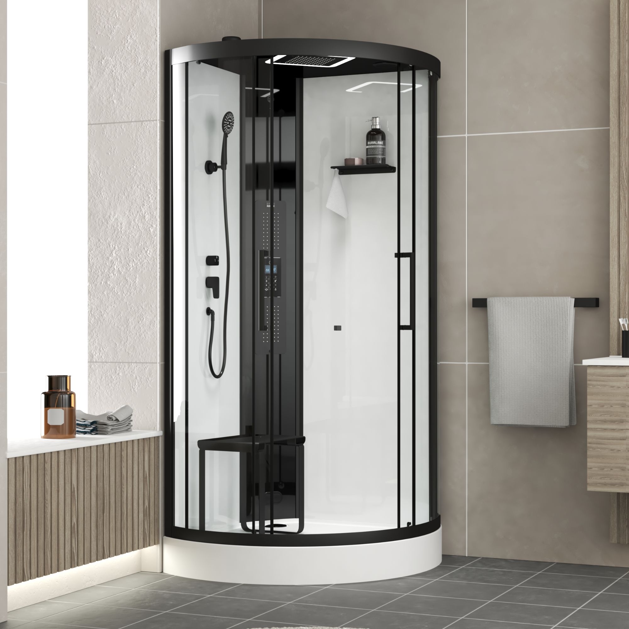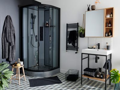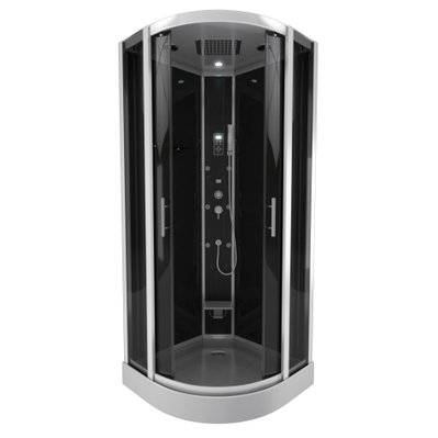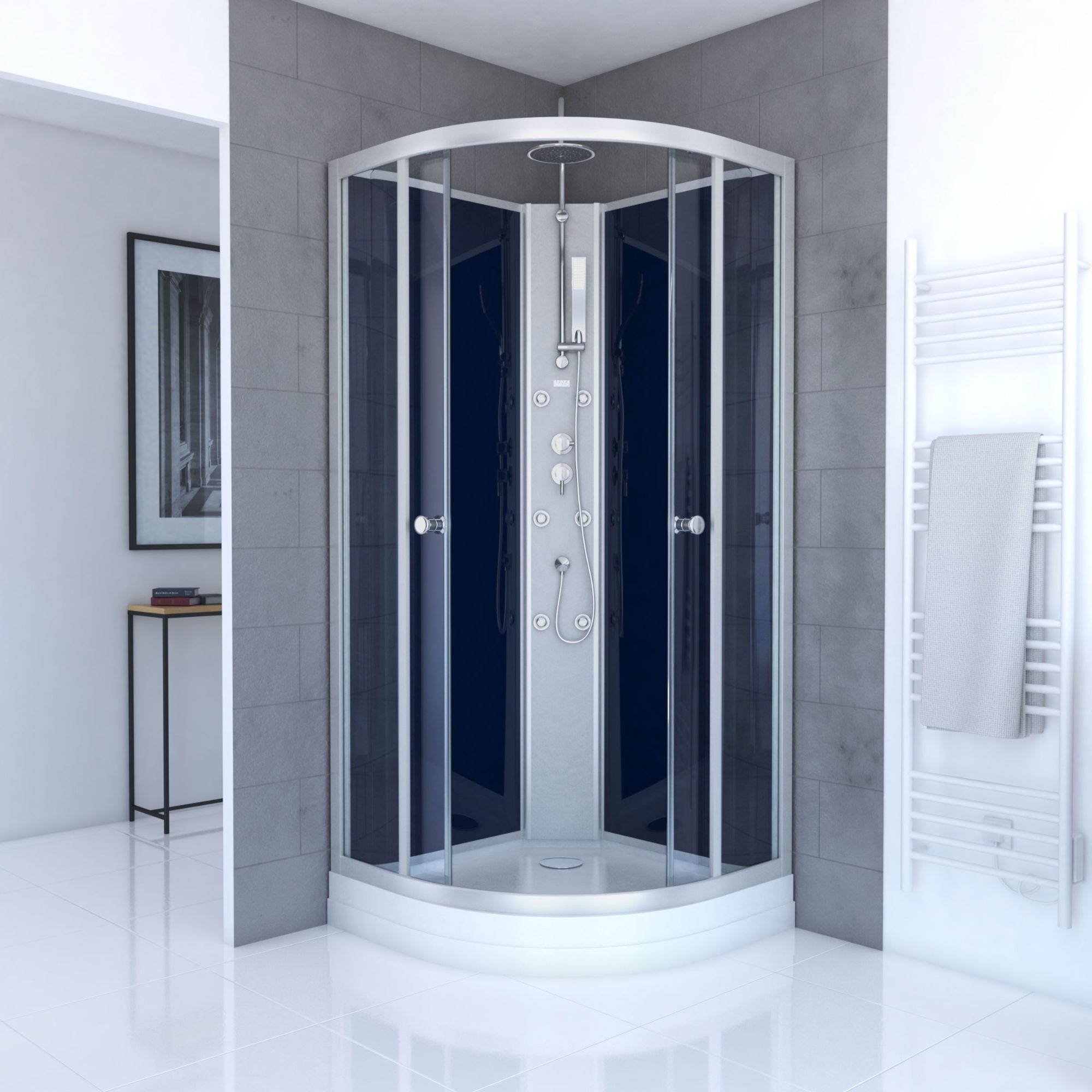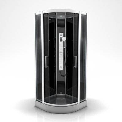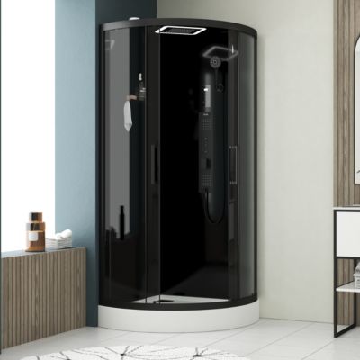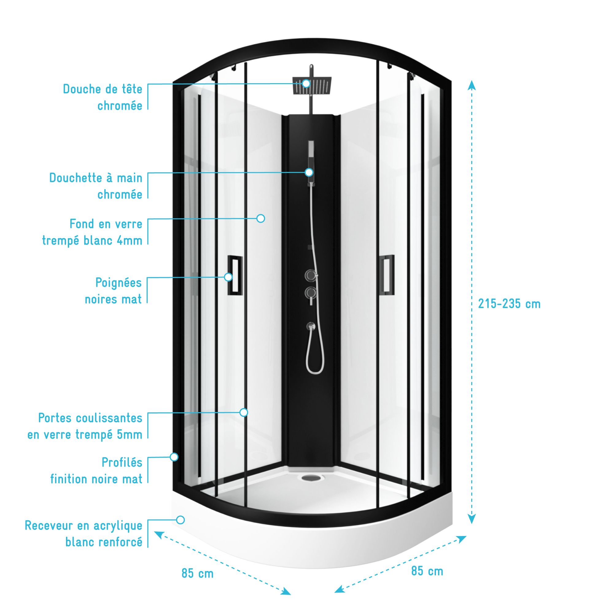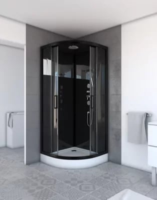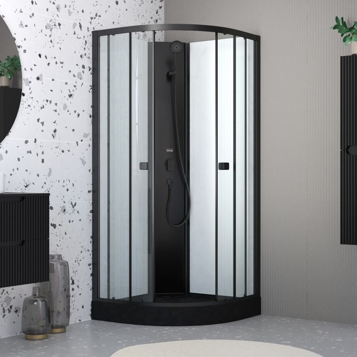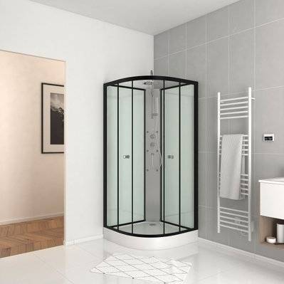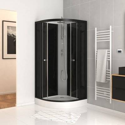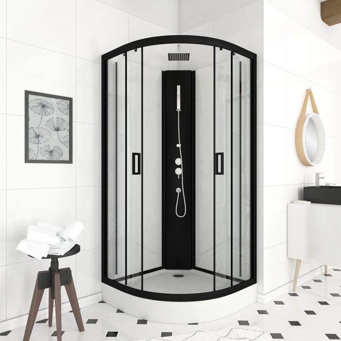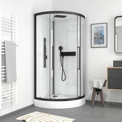 Cabine de douche 1/4 de cercle 85x85x200 cm - Portes coulissantes - Fonds Blancs & Profilés Noir Mat