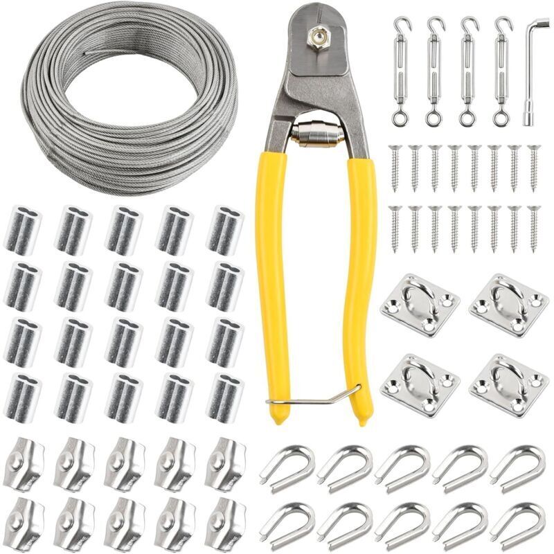50m Serre Cable Acier, 67 Pcs Kit Gaine Cable 3mm 7x7 avec 4 Tendeur Cable, 20 Boucles Sertissage, 10 Cosses Cable, 10 Pinces, 4 Crochets Muraux,