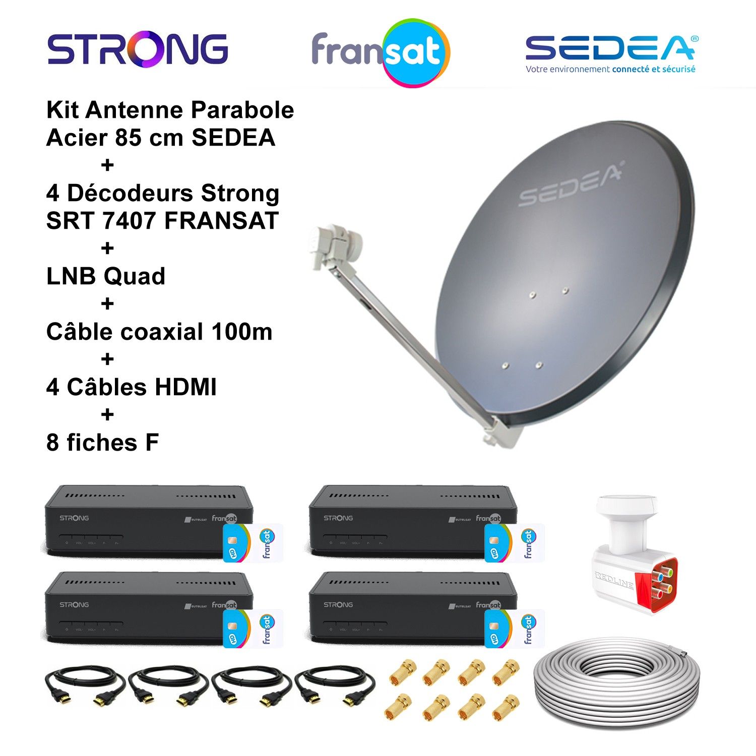Kit Parabole Acier 85cm Anthracite + LNB Quad HD 4K + 4 Décodeurs SRT 7407 FRANSAT + Câble 100m + 4 Câbles HDMI + 8 Fiches F
