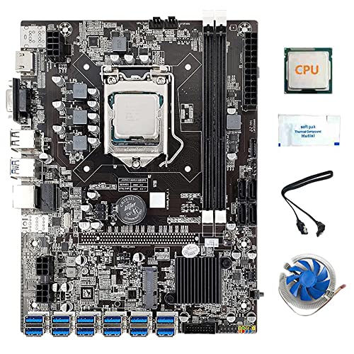 Tweovnai 8 Carte MèRe GPU B75 Mining + CPU + Ventilateur + Graisse Thermique + Câble d'alimentation + Câble SATA 8 Emplacement USB3.0 (PCIE) LGA1155 DDR3 RAM SATA3 .0