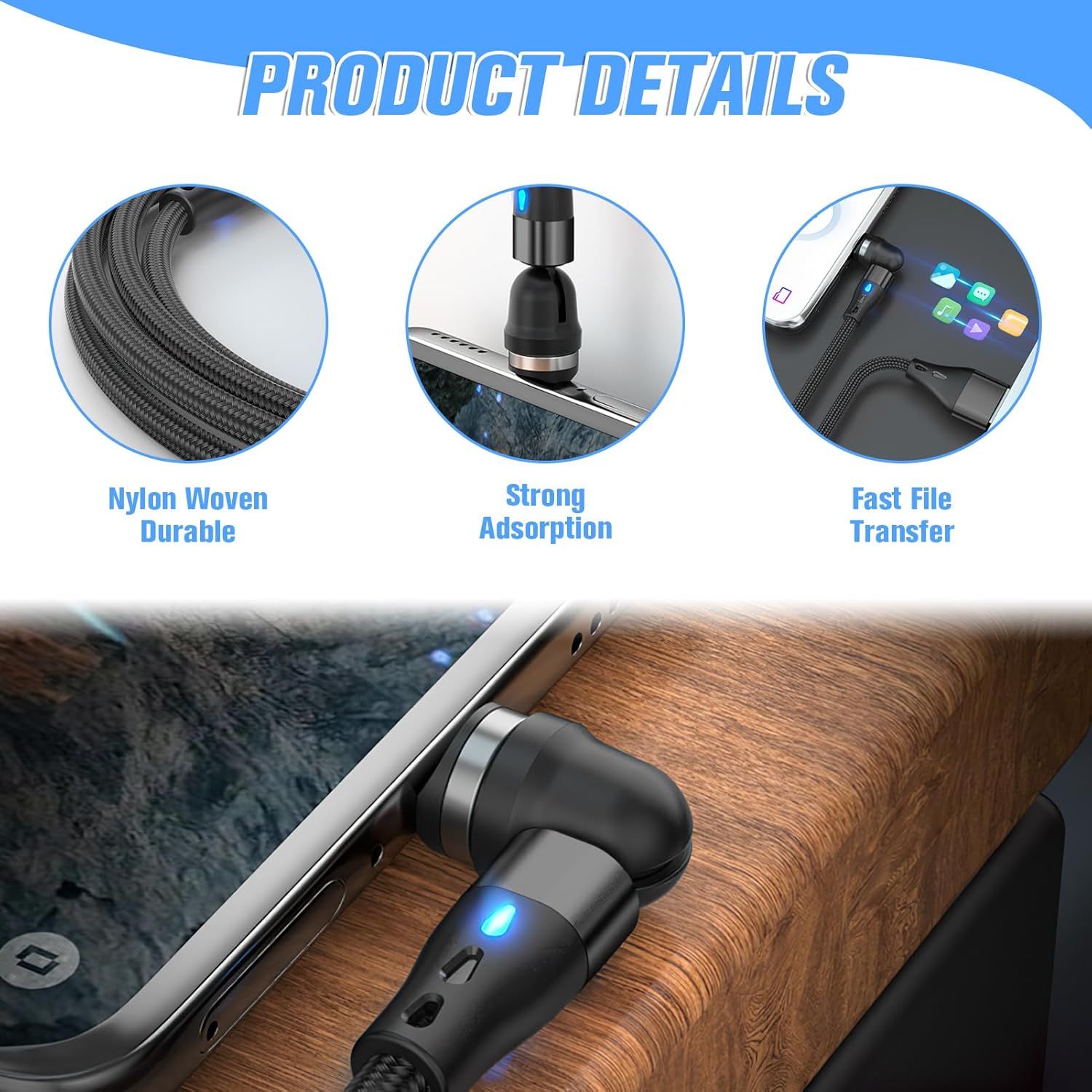 Câble de Charge Magnétique USB C, Chargeur magnétique, 1M/2M Câble USB magnétique Charge Rapide 3A Transfert de Données Rotation à 360 ° et 180, Câble 3 en 1 pour Micro USB/Phone/Type C smartphones