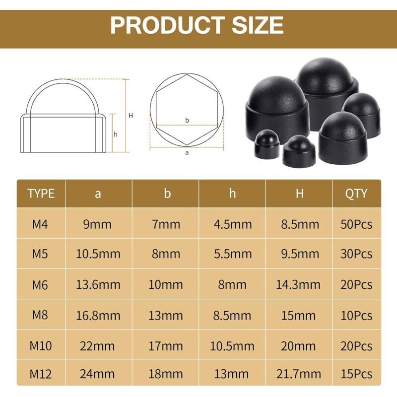 145 Pièces Cache Ecrou, M4 M5 M6 M8 M10 M12 Cache Boulon Noir Bouchon Ecrou Cache Tete de Vis Capuchon Ecrou, Hexagonal Protection Cache pour Écrous