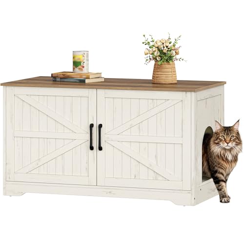 Fobyfurny Meuble Litiere pour Chat, Meuble Cache Litiere Chat, Maison de Toilette Chats en Bois avec Entrée Latérale, Style Ferme, Maison pour Chat D'intérieur, 100 x 50 x 55 cm, Marron et Blanc