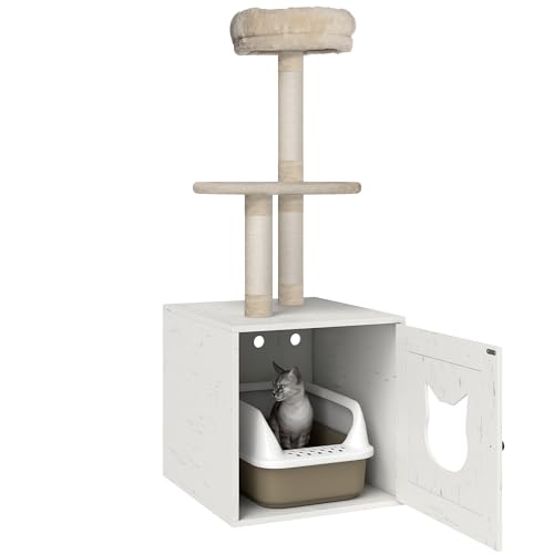 PawHut Arbre à Chat avec Maison de Toilettes, Tour de Jeu 2-en-1, Niche pour Chat de 129 cm avec Cache-litière, poteaux à griffer, Plateforme, lit, crème