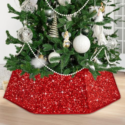 Odot Cache Pied Sapin de Noel Paillettes, Couvre Pied Sapin Noël Rouge, Christmas Tree Skirt pour Décorations de Fête à Domicile (55 x 72 x 26 cm)