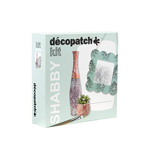 Décopatch KIT024C - Un kit adulte comprenant un cadre, un cache pot et un vase en papier pulpé brun, 4 feuilles Décopatch, un pinceau et un pot de vernis colle, SHABBY