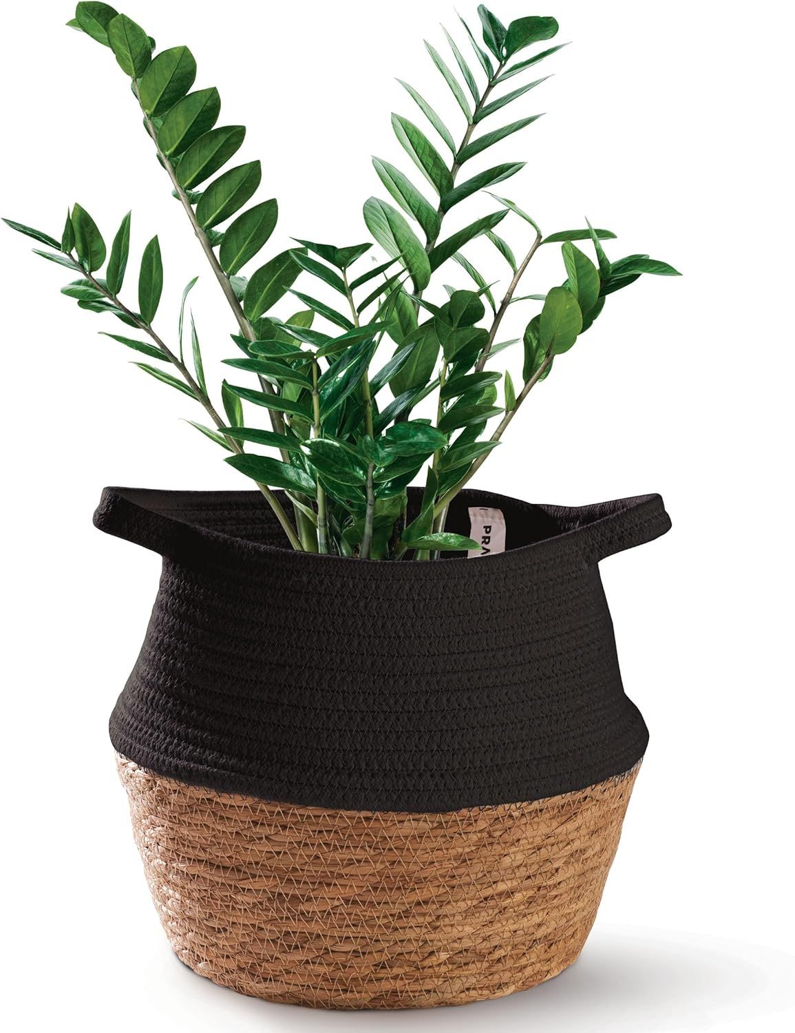 Praknu Panier à Plantes Osier en Jonc de Mer et Coton - Cache Pot Décoratif Tressé - 25 cm - Pot à Fleurs, à Plantes et Panier Rangement (Noir)