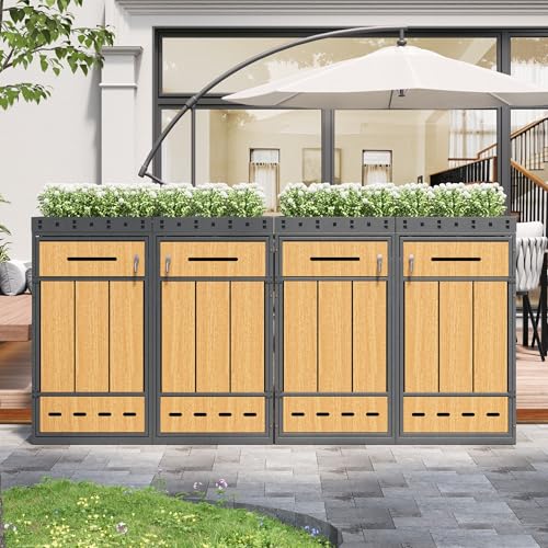 Merax Cache-poubelles aspect bois avec toit végétal pour 4 poubelles de 120 à 240 l, armoire en acier, avec serrure et chaînes, revêtement de poubelles pour jardin et allée