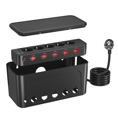 Boîte de Rangement pour Câbles avec Multiprise USB, Prise Multiple avec Interrupteur Individuel, Boite Cache Cable Multiprise, Cache Bloc Prise Parafoudre et Surtension, Rallonge 1,5m, Noir
