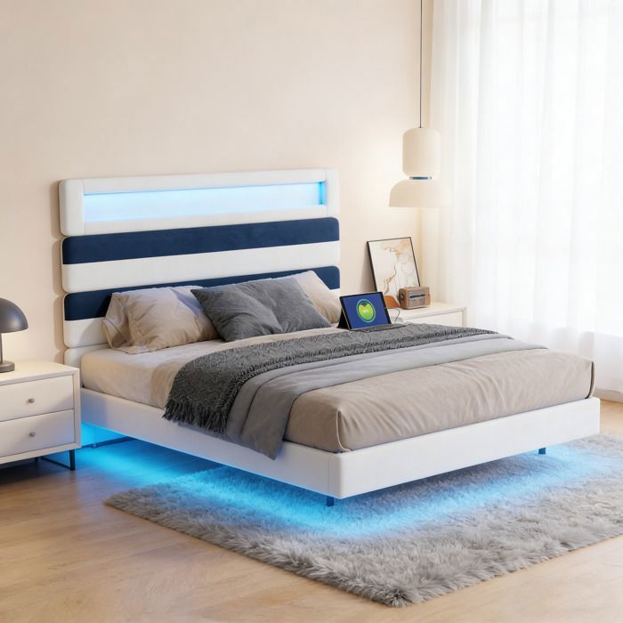 Lit Flottant 140x190 avec LED - Prises/Ports USB/Type-C -Tête de Lit Réglable -Pieds cachés - Cadre de Lit 2 Places - Velours Blanc