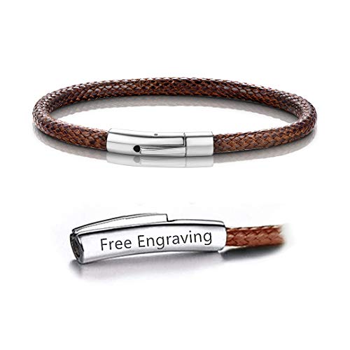 Bracelet Cordon Personnalisé Prénom Gravé Homme Femme Cuir Perles Acier Inoxysable Anneaux Gravure Personnalisable-Bijoux Cadeau Fete Des Père Mère Garçon Fille Anniversaire Couple Ami Marron-22 CM