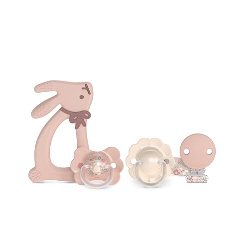 Suavinex, Cadeau Naissance, Coffret Cadeau Bébé avec : Sucette avecTétine Symétrique SX Pro 0-6 Mois + Attache Sucette + Boîte à Sucettes + Anneau de Dentition en Silicone. (4 Pcs). Wonderland, Rose