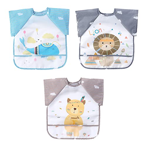 URFEDA 3PCS Bavoir Bebe Tablier sans Manches Bavoir Etanche 6 Mois à 3 Ans Tablier d'alimentation de Jeu/de Peinture Bavoir Imperméable Enfant Bébé Tablier avec Grande Poche, Cadeau pour Enfants