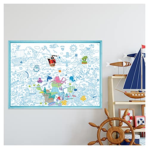 YETI BLANK DESIGNS - Poster Géant XL à Colorier avec 150+ stickers - Atlantis et la vie sous marin mer - 100x70cm - idée cadeau poster avec autocollants - facile à encadrer - coloriage enfants