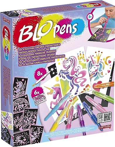 Lansay BLOPENS - Set d'Activités Chevaux Fantastiques - 8 Feutres de Coloriage À Souffler+ 6 Pochoirs Réutilisables + Feuilles - Idée Cadeau Enfants dès 5 Ans - Kit Dessins Licornes Prêt à Utiliser