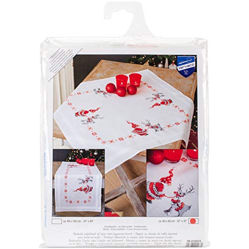 Vervaco Kit Broderie Pré-Imprimé Nappe GNOMES DE NOËL Complet Set DIY Adulte Decoration Table Manuelle Loisir Créatif Cadeau Femme ca. 80 x 80 cm Embroidery Patron