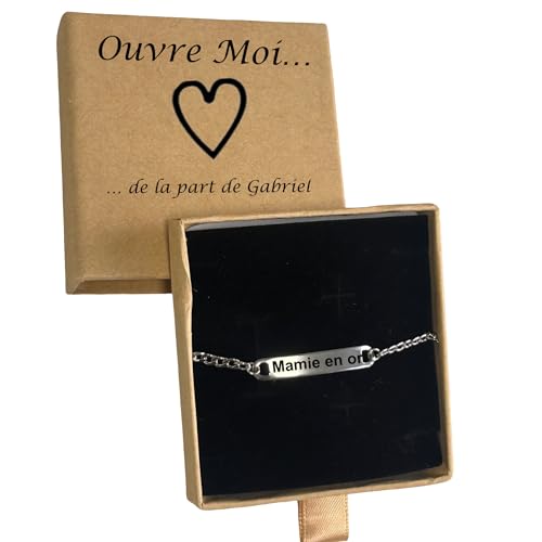 SARAI SHOP Bracelet Gourmette Personnalisé avec Boîte Cadeau, Chaîne gourmette, boite gravé personnalisé, de la part de, bracelet réglable de 17 à 22 cm, cadeau mamie, fête des grands meres