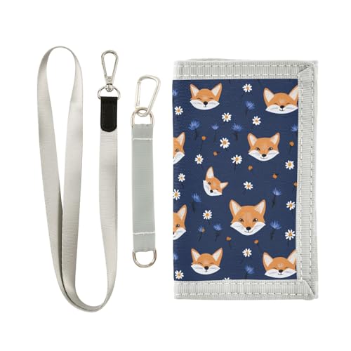 Portefeuille minimaliste à trois volets personnalisé avec motif renard et fleur bleue, cadeau pour jeune homme tendance avec cordon, Fleur de renard personnalisée bleue, 1 size