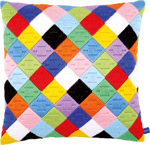 Vervaco Kit Complet Broderie Point Lancé Coussin Decoratif MOTIF DAMIER COLORÉ DIY Debutant Adulte Decoration Manuelle Cadeau Loisir Creatif Maison ca. 40 x 40 cm Embroidery