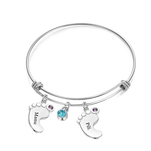 Lovejewellery Personnalisé Bracelet Prenom 2/3/4 Bébé Pied Pendentif Gravure pour Femme Cadeau la Fête des Mères Bijoux Personnalisable Gravé pour Anniversaire Marriage Maman Fille (2 stone)